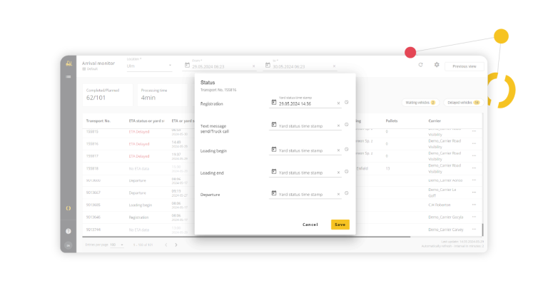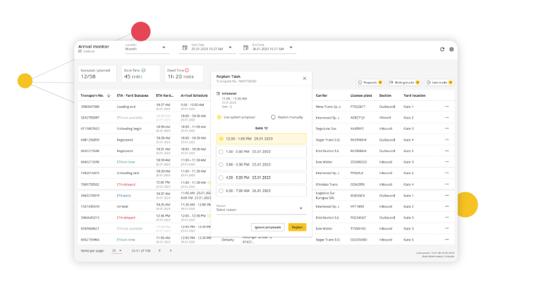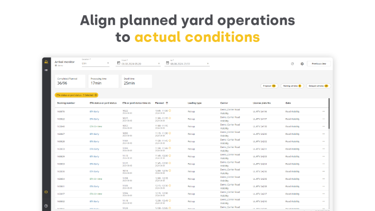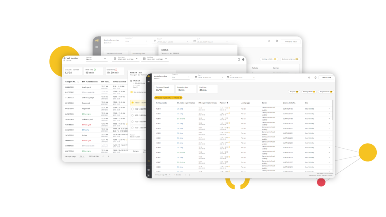 Erhalten Sie beispiellose Visibility und Kontrolle mit unserer Real-Time Yard Management-Lösung. Ermöglichen Sie Lagerleitern, Teamleitern und Arbeitern, den gesamten Betriebshof zu überwachen, Informationssilos abzubauen und die Effizienz zu steigern. Indem Sie potenzielle Verzögerungen frühzeitig identifizieren, können Sie die Gesamtproduktivität verbessern und Ihre Prozesse optimieren. Unsere umfassende Lösung integriert Transportmanagement, Dock-Scheduling (Time Slot Management), Betriebshofmanagement und Betriebshofautomatisierung – alles auf der Basis von Echtzeitdaten.