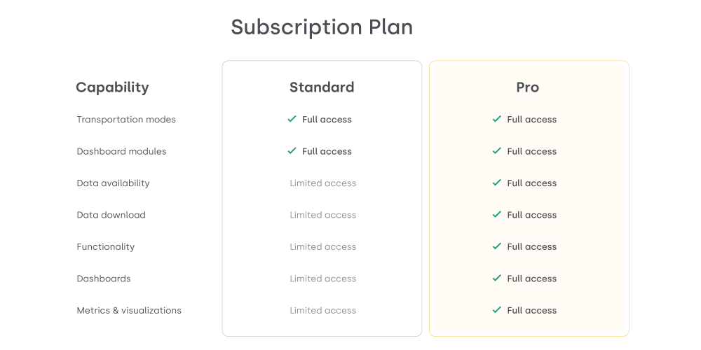 Standard Plan: An entry-level subscription that includes essential reporting and analytics capabilities.