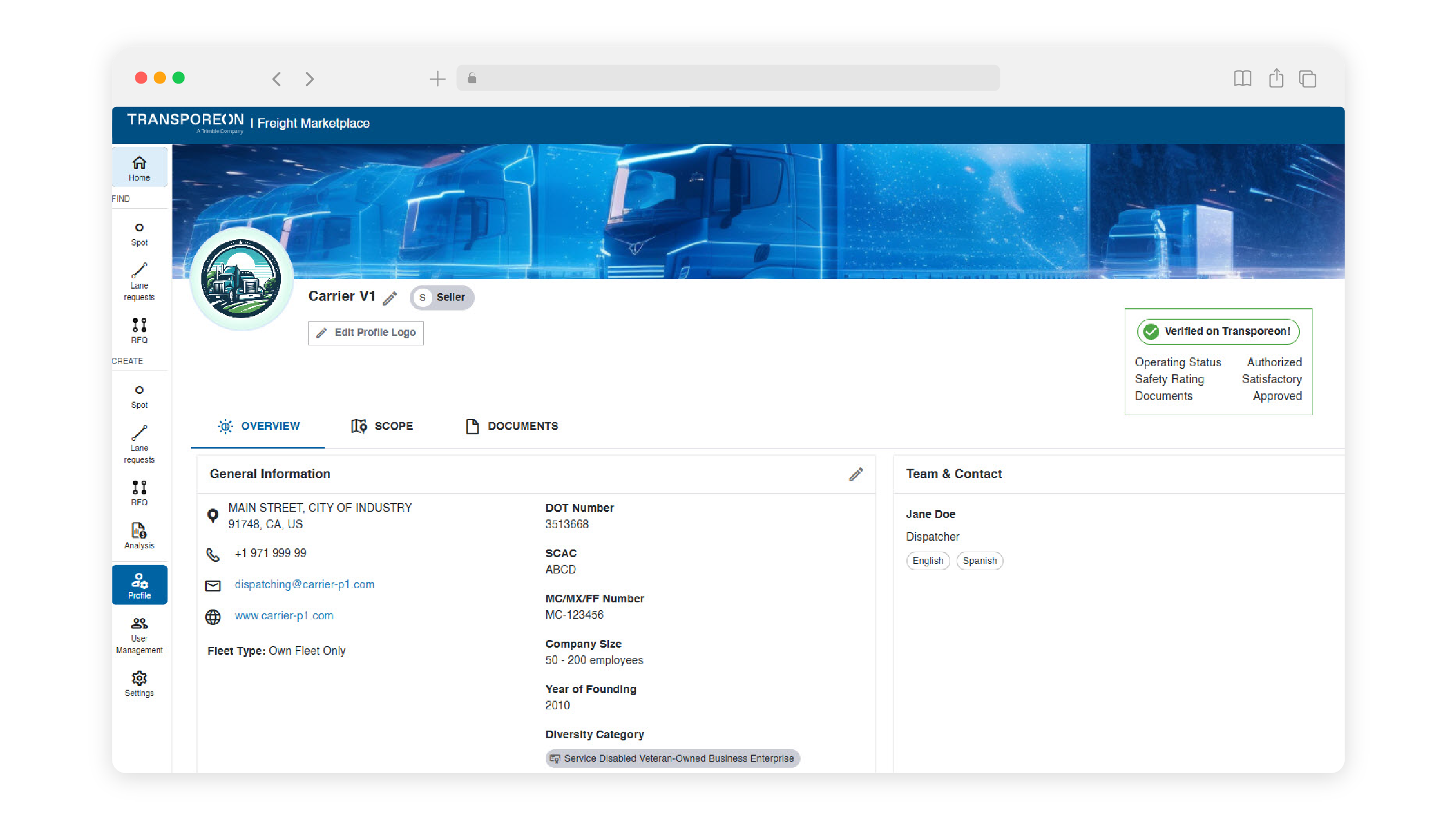Faster and safer procurement. Freight Marketplace includes automatic checks of carrier documents and certifications using AI, saving time and reducing risk.