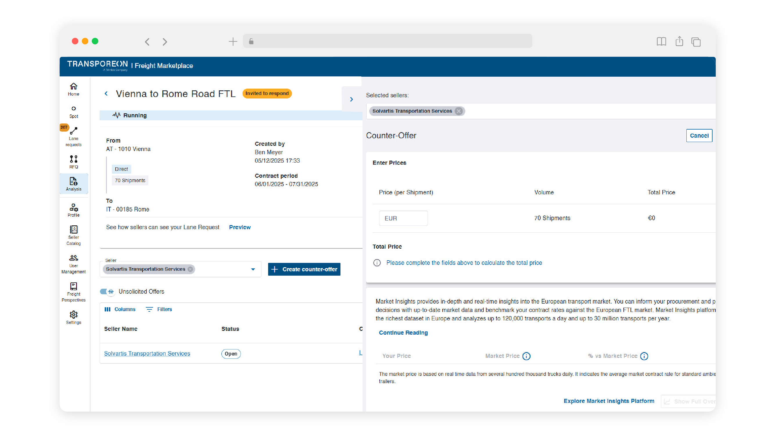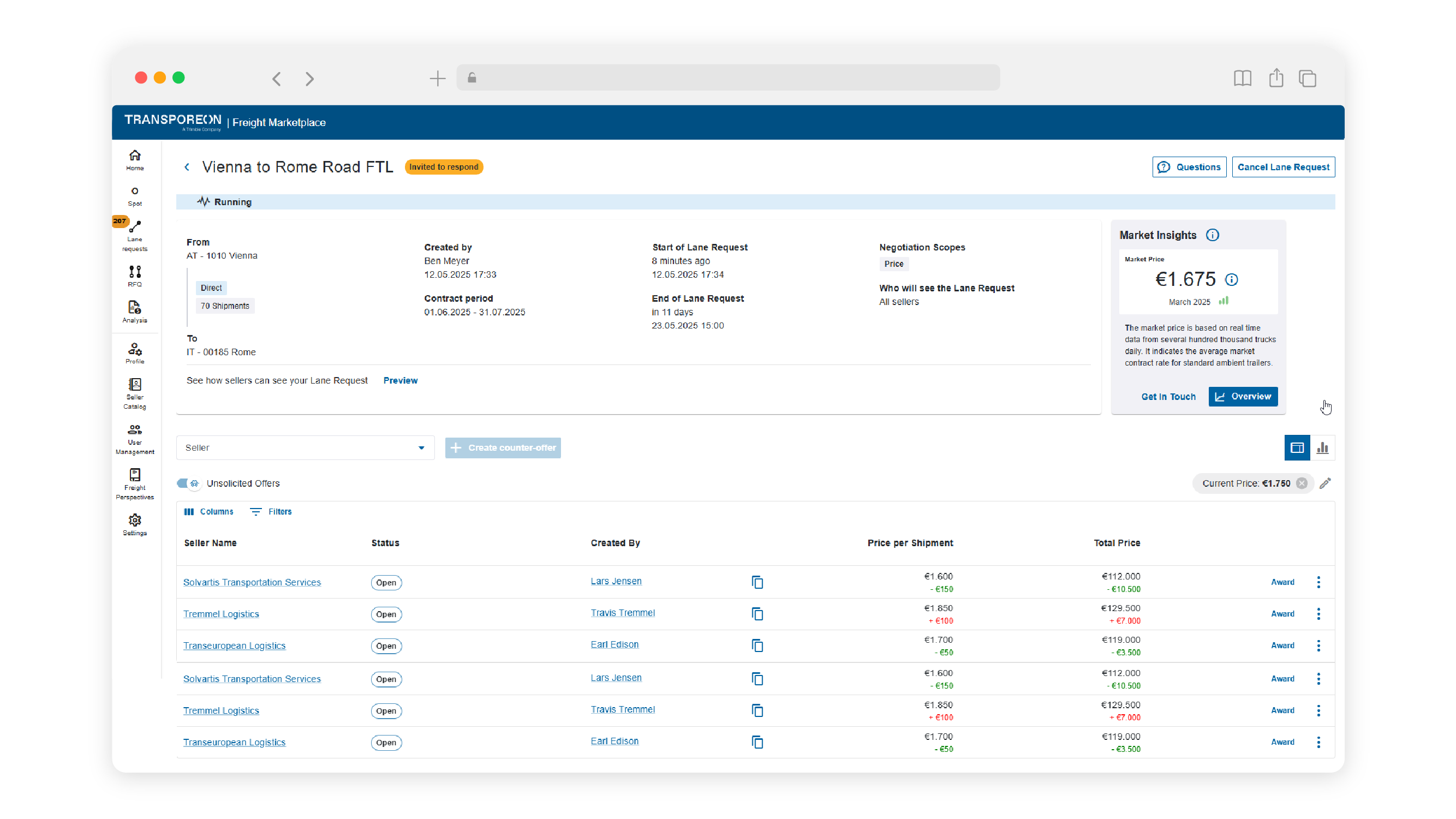 - Market data from Transporeon's Market Insights tool will be included in the sourcing process.