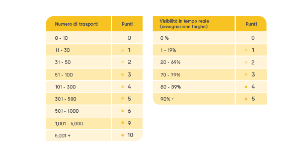 Il numero dei trasporti spot e contrattuali effettuati e le tue prestazioni di visibilità in tempo reale sulla piattaforma Transporeon ti collocheranno in uno dei quattro livelli del nostro Programma di Fedeltà per Trasportatori:
