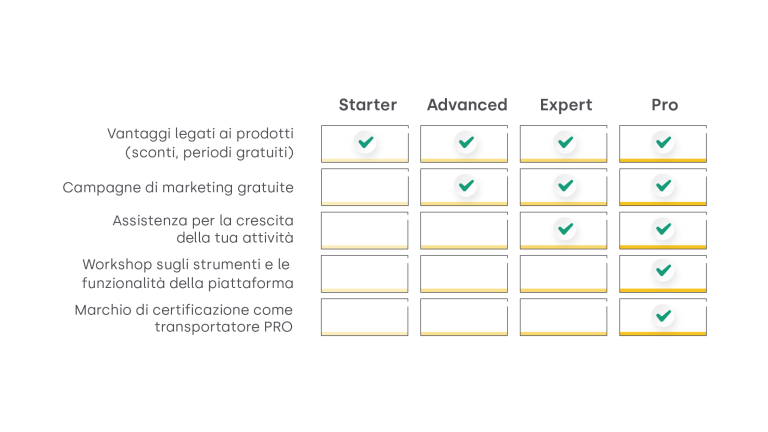 Dai periodi di utilizzo gratuiti all'accesso esclusivo, passando per prodotti dedicati ai trasportatori, supporto personalizzato e campagne di marketing per la tua attività: lanciamo sempre nuovi incentivi per ringraziarti della tua fedeltà.